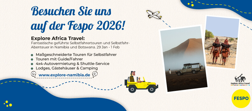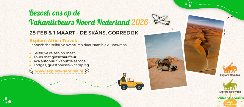 Explore Namibia will be at the Vakantiebeurs Noord Nederland, 28 feb – 01 march 2026, Gorredijk. Anyone interested in a self-drive adventure or a private guided tour in Namibia and/or Botswana is warmly invited to visit our booth to discuss your personal travel plans with one of our travel experts.
