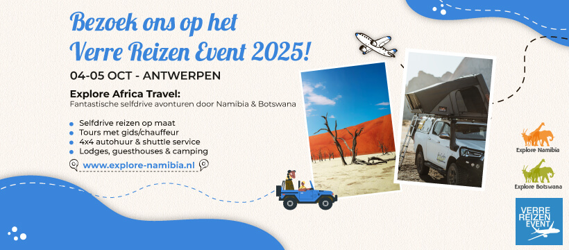 Explore Namibia will be at the Verre Reizen Event Antwerpen, 4-5 oktober 2025, Antwerpen. Anyone interested in a self-drive adventure or a private guided tour in Namibia and/or Botswana is warmly invited to visit our booth to discuss your personal travel plans with one of our travel experts.