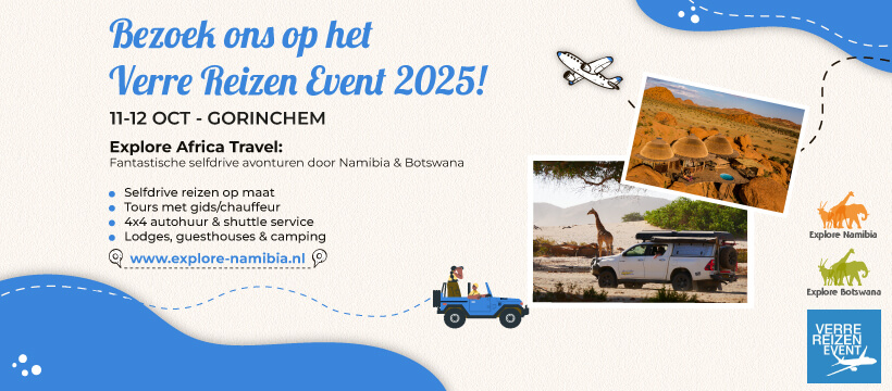 Explore Namibia will be at the Verre Reizen Event Gorinchem, 11-12 oktober 2025, Next Level in Gorinchem. Anyone interested in a self-drive adventure or a private guided tour in Namibia and/or Botswana is warmly invited to visit our booth to discuss your personal travel plans with one of our travel experts.