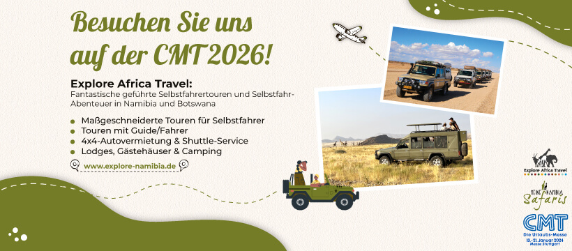 Explore Namibia will be at the CMT Die Urlaubsmesse, 17-25 januari 2026, Stuttgart. Anyone interested in a self-drive adventure or a private guided tour in Namibia and/or Botswana is warmly invited to visit our booth to discuss your personal travel plans with one of our travel experts.