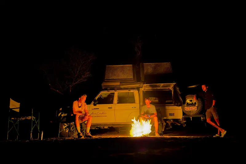 In the evening, we drive to our campsite, nestled in the heart of the wilderness. Under the clear starry sky, we gather around the campfire, sharing stories and reflecting on the day’s experiences. However, we must remain vigilant, as the campsites are unfenced, and wild animals can roam through or pass by the camp at any time.
