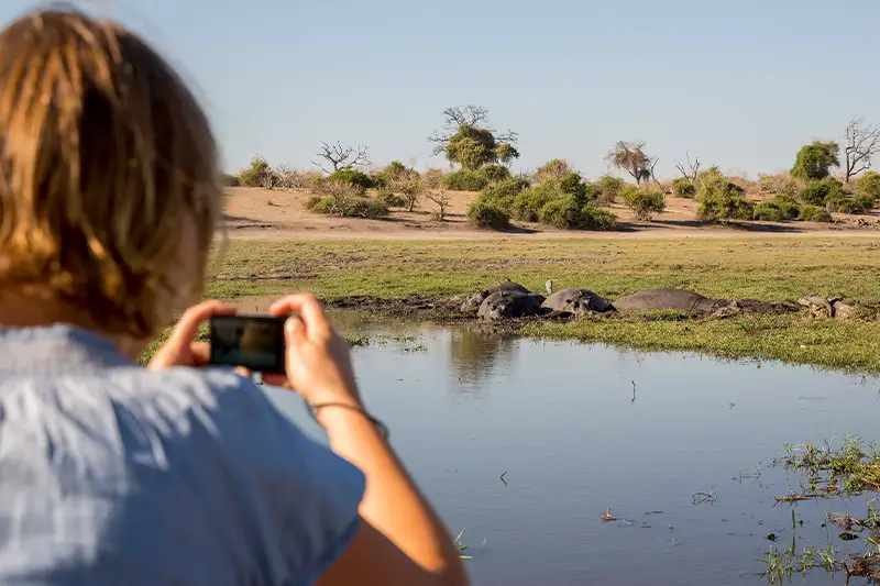 We leave the bushland of northern Botswana and head to the northernmost border river of Botswana, the Chobe River. We’ll traverse small tracks along the Chobe River, renowned for its abundant wildlife. Many animals from the national park come to the river to drink, offering us the opportunity to observe large herds of elephants, buffaloes, antelopes, giraffes, and big cats. In the water, many crocodiles and hippos can be spotted.
